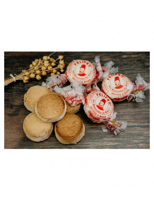 Elaborados a mano con harina de trigo, azúcar glas, manteca de cerdo y harina de almendra marcona. Los mantecados Felipe II, guardan celosamente la tradición artesanal familiar que durante siglos ha hecho de ellos un dulce exquisito y selecto, reconocido por los gustos más exigentes.
